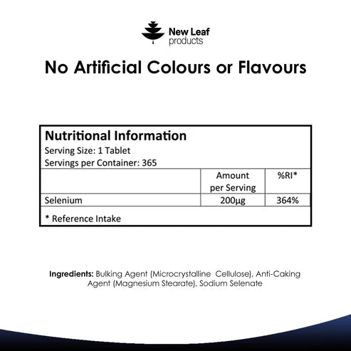 New Leaf’s Selenium Tablets provide 200 µg per serving, with 365 tablets — a full year’s supply — making it easy to maintain optimal selenium levels every day. Selenium is an essential trace element that supports immune function, thyroid health, and antioxidant protection, particularly important for those with limited dietary sources.